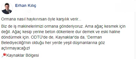 Geçtiğimiz yıllarda Buca Kaynaklar'da izinsiz olarak onlarca ağaç kesilmiş ve bu görüntü kamu vicdanında sert tepkilerin oluşmasına sebep olmuştu. Buca Belediye Başkanı Erhan Kılıç yaptığı sosyal medya paylaşımıyla talan edenlere karşı savaş açtığını belirtti.