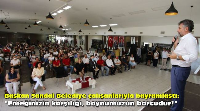 Önümüzdeki günlerde sendika ile yapılacak işçi sözleşmeleriyle ilgili de konuşan Sandal, sözlerini şöyle tamamladı: "Biz sendikayla bir bütünüz. Çalışanlarımız için en doğru olanı bulmalıyız. Adaletin olmadığı yerde mutluluk göreceli olur. Biz bunu istemiyoruz. Esnek çalışmayı ortadan kaldıracağız. Belediyeye liyakat sistemini getireceğiz. Eşit işe, eşit ücret vereceğiz. Adil olacağız, vicdanlı olacağız. Umudunuzu yitirmeyin! Bu kentin size, bize, doğru, dürüst, ahlaklı, vicdanlı insanlara ihtiyacı var. Biz böyle dik durdukça, bir bütün oldukça tüm sorunların üstesinden geliriz. Çalışan arkadaşların temel hak ve kazançlarıyla ilgili negatif bir düşüncemiz yok. Belki de bu konuda gündemine işçi reformunu, çalışma barışını sağlamayı alan ender belediyelerden biriyiz. Aynı işi yapan iki arkadaşın farklı ücret almasına müsaade etmeyeceğiz. Sabahtan akşama kadar sokakta olan temizlik işçilerimiz var. Onlar başımızın tacı. İşini doğru yapan, üreten, halktan, emekten yana olan ve sadece evinin kazancı için canla başla çalışan her arkadaşımızın başımızın üstünde yeri var. Biz kimsenin inancıyla, görüşüyle ilgilenmiyoruz. Belediye kaynaklarını, kendi öz varlığımızdan daha değerli bilerek, kimsenin bu kaynağı haksız yere kullanmasına müsaade etmeyeceğiz. Biz işimize siyasetle bakmıyoruz. Çünkü bizim yüreğimizde Allah korkusu var. Kula bakınca utanacak yüz var. Bu belediye, halkın belediyesidir. Önümüzdeki süreçte de Bayraklı halkının ve çalışanlarımızın yanında olmaya devam edeceğiz. Sizin emeklerinizin karşılığı bizim boynumuzun borcudur. Sizi seviyoruz. İyi ki varsınız Kurban Bayramınız kutlu olsun."