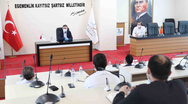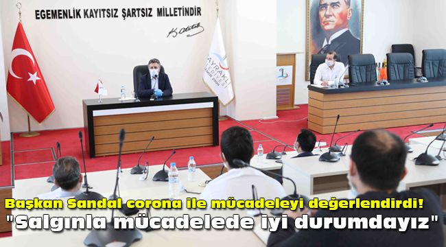 Bayraklı Belediye Başkanı Serdar Sandal, belediyenin Salgınla Mücadele Eylem ve Koordinasyon Kurulu toplantısına katılarak, son bir ayda yapılan çalışmaları değerlendirdi. İlgili birim müdürlerinden bilgi alan Sandal, "Yasal izinlerle personel sayımız azalmasına rağmen temizlikte ve alınan tedbirlerin uygulanması noktasında iyi durumdayız. Bir yandan temizlik ve dezenfekte işlemleri sürerken, diğer yandan yurttaşlarımızın mağdur olmaması için sosyal yardımlarımıza devam ediyoruz. Bu süreçte özveriyle çalışan tüm mesai arkadaşlarıma teşekkür ederim" dedi.