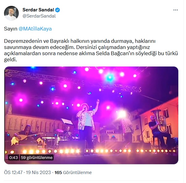 Depremzedenin ve Bayraklı halkının yanında olmaya devam edeceklerini vurgulayan Başkan Sandal, Selda Bağcan tarafından seslendirilen “Yuh Yuh” şarkısını da paylaşımına ekledi.Başkan Sandal’ın paylaşımı şu şekilde:“Sayın Atilla Kaya;Depremzedenin ve Bayraklı halkının yanında durmaya, haklarını savunmaya devam edeceğim. Dersinizi çalışmadan yaptığınız açıklamalardan sonra nedense aklıma Selda Bağcan’ın söylediği bu türkü geldi..."