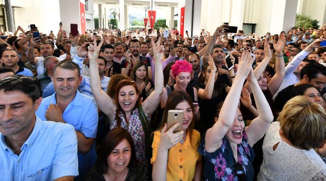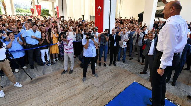 İzmir Büyükşehir Belediyesi’nin kapısından içeri girdiğinden beri her yerde personelin güvenini, sevgisini ve sempatisini hissettiğini ifade eden Başkan Soyer, “Bu büyük ailenin bir parçası olduğum için gurur duyuyorum. Buna layık olmak için canla, başla, aşkla çalışmaya devam edeceğim” şeklinde konuştu.