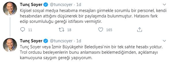 Tunç Soyer veya İzmir Büyükşehir Belediyesi'nin bir tek sahte hesabı yoktur. Trol ordusu besleyenlerin bunu anlamasını beklemediğimden, açıklamayı kamuoyuna saygım gereği yapıyorum.