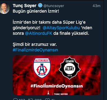 TFF 1. Lig play-off Altay - Altınordu final maçı 26 Mayıs Çarşamba günü oynanacak. Karşılaşmanın oynanacağı stat ve saat henüz TFF tarafından açıklanmadı.Final karşılaşması beIN SPORTS ve TRT Spor'dan canlı yayınlanacak.Final, federasyonun belirleyeceği tarihte ve stadyumda tek maç usulü oynanacak. 90 dakikada eşitliğin bozulmaması durumunda maç uzatmalara gidecek. Uzatma devrelerinde de eşitlik bozulmazsa kazananı penaltı atışı belirleyecek.Finalde galip gelen takım gelecek sezon Süper Lig'de mücadele edecek.İzmir Büyükşehir Belediye Başkanı Tunç Soyer'de sosyal medya hesabından açıklama yaparak finalin İzmir'de oynanması için çağrı yaptı.