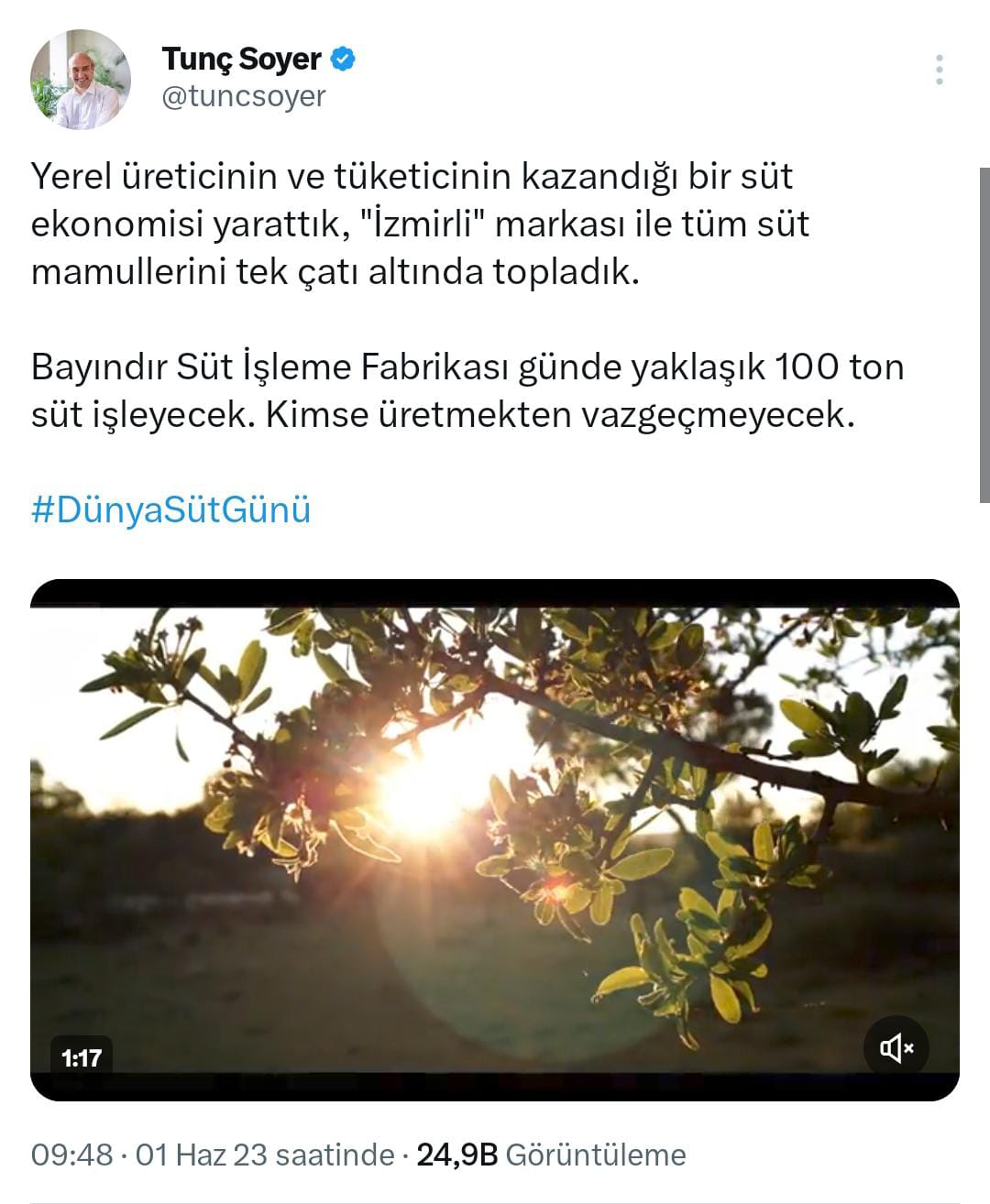 İZMİR GÜNDEMİ- İzmir Büyükşehir Belediye Başkanı Tunç Soyer 1 Haziran Dünya Süt Günü'nü kutladı. Yerli üreticinin ve tüketicinin kazandığı bir süt ekonomisi yaratmayı başardıklarını söyleyen İzmir Büyükşehir Belediye Başkanı tunç soyer sosyal medya üzerinde bir paylaşımda bulundu.İzmir Büyükşehir Belediye Başkanı Tunç Soyer sosyal medya üzerinden yaptığı paylaşımda;"Yerel üreticinin ve tüketicinin kazandığı bir süt ekonomisi yarattık, “İzmirli” markası ile tüm süt mamullerini tek çatı altında topladık.Bayındır Süt İşleme Fabrikası günde yaklaşık 100 ton süt işleyecek. Kimse üretmekten vazgeçmeyecek."