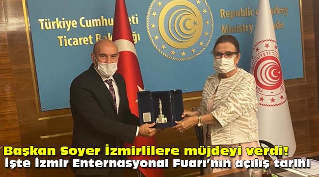 İzmir Büyükşehir Belediye Başkanı Tunç Soyer, Ticaret Bakan Ruhsar Pekcan ile Ankara’da yaptığı görüşmeden sonra İzmir Enternasyonal Fuarı’nın 9-13 Eylül tarihleri arasında Kültürpark’ta pandemi kurallarına uygun olarak açılacağını duyurdu.