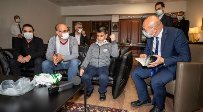 Kusursuz kulağa (absolut kulak) sahip doğuştan görme engelli Bager Çalışcı, İzmir Büyükşehir Belediye Başkanı Tunç Soyer'i makamında ziyaret etti. 9 yaşındaki Bager’e, babası Mehmet Çalışcı ve müzik öğretmeni Caner Keser eşlik etti.
