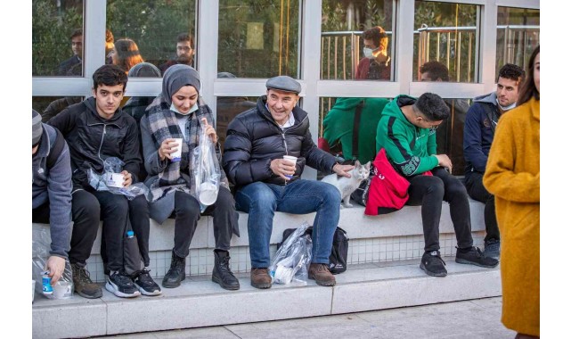 Her fırsatta öğrencilere desteğini açıklayan İzmir Büyükşehir Belediye Başkanı Tunç Soyer 2021 yılının son akşam yemeğini üniversitelilerle yedi. Ege Üniversitesi Eczane Hizmetleri öğrencisi Tuba Macit'in yemek daveti üzerine Başkan Soyer, Büyükşehir Belediyesi'nin Ege Üniversitesi Bornova Kampüsü'ndeki yemek dağıtım noktasında üniversitelilerle buluştu. Başkan Soyer, öğrencilerle yemek sırasına girdi. Yemekteki keyifli sohbetin ardından birlikte fotoğraf çektirme isteklerini kırmayan Soyer, öğrencilere iyi bir yıl diledi.