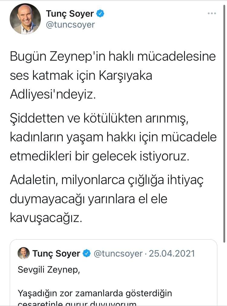 İzmir Büyükşehir Belediye Başkanı Tunç Soyer'in yaptığı açıklama ise şöyle;"Bugün Zeynep'in haklı mücadelesine ses katmak için Karşıyaka Adliyesi'ndeyiz. Şiddetten ve kötülükten arınmış, kadınların yaşam hakkı için mücadele etmedikleri bir gelecek istiyoruz. Adaletin, milyonlarca çığlığa ihtiyaç duymayacağı yarınlara el ele kavuşacağız."