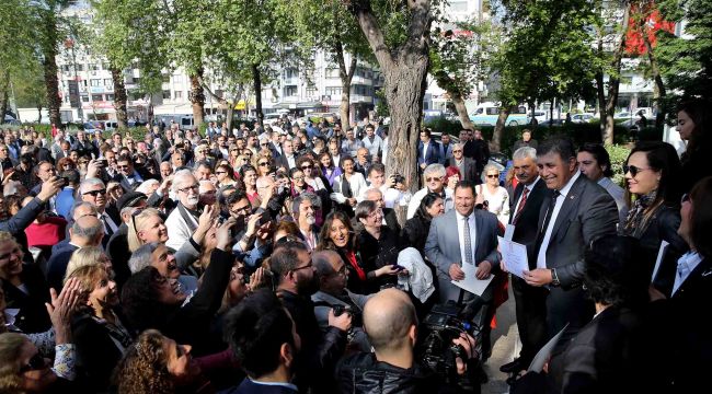 Karşıyaka Belediye Başkanı Dr. Cemil Tugay, mazbatasını almak üzere sabah erken saatlerde eşi Öznur Tugay ile birlikte Karşıyaka Adliyesi’ne geldi. Tugay’a, CHP Karşıyaka İlçe Başkanı Uğur Yıldırım, partililer, meclis üyeleri, muhtarlar, sivil toplum örgütlerinin temsilcileri ve yüzlerce Karşıyakalı da eşlik etti. Meclis üyeleri ile birlikte mazbatasını alan Dr. Cemil Tugay, alkışlar eşliğinde İlçe Seçim Kurulu’ndan çıkarak Karşıyaka Belediyesi’ne geçti. “BAYRAĞI ONURLA TAŞIYACAĞIM”Belediye önünde büyük coşkuyla karşılanan Başkan Tugay, “8 Nisan tarihi hayatımın en anlamlı tarihlerinden biri oldu. Bugün burada, 5 yıllık çok onurlu bir görevi devralıyorum. Beni bu göreve layık gören parti örgütüme ve oylarıyla göğsümüzü kabartan Karşıyaka halkına teşekkür ediyorum. Allah bu görevi onurla yapmayı nasip etsin. 5 yıl boyunca bu bayrağı onurumla taşıyacağıma söz veriyorum. Zühtü Işıl’ın, Fikri Altay’ın, Zübeyde Annemizin ve Mustafa Kemal Atatürk’ün kentinde, onların ışıkları yolumuzu aydınlatacaktır. Hepimize hayırlı uğurlu olsun. İstanbul’dan da müjdeli haberi bekliyoruz. İnanıyoruz ki Ekrem İmamoğlu da mazbatasını en kısa sürede alacaktır.” dedi. “HER ZAMAN PARTİMİN HİZMETİNDEYİM”Görevi törenle Dr. Cemil Tugay’a devreden Hüseyin Mutlu Akpınar da “5 yıl boyunca onurumuzla çalıştık, Karşıyakamız için güzel hizmetler ürettik. Görevi yine bir CHP’li kardeşime devretmenin mutluluğunu yaşıyorum. Her zaman partimin hizmetinde olmaya devam edeceğim” diye konuştu. “ÇİÇEK YERİNE BAĞIŞ YAPIN” ÇAĞRISIKarşıyaka Belediye Başkanı Dr. Cemil Tugay, tebrik için çiçek göndermek isteyenlerin, bunun yerine Atatürkçü Düşünce Derneği Karşıyaka Şubesi öğrenci burs hesabına ya da Karşıyaka Bisiklet Kooperatifi’nin Bisikletsiz Çocuk Kalmasın kampanyasına bağışta bulunabileceklerini de ifade etti.