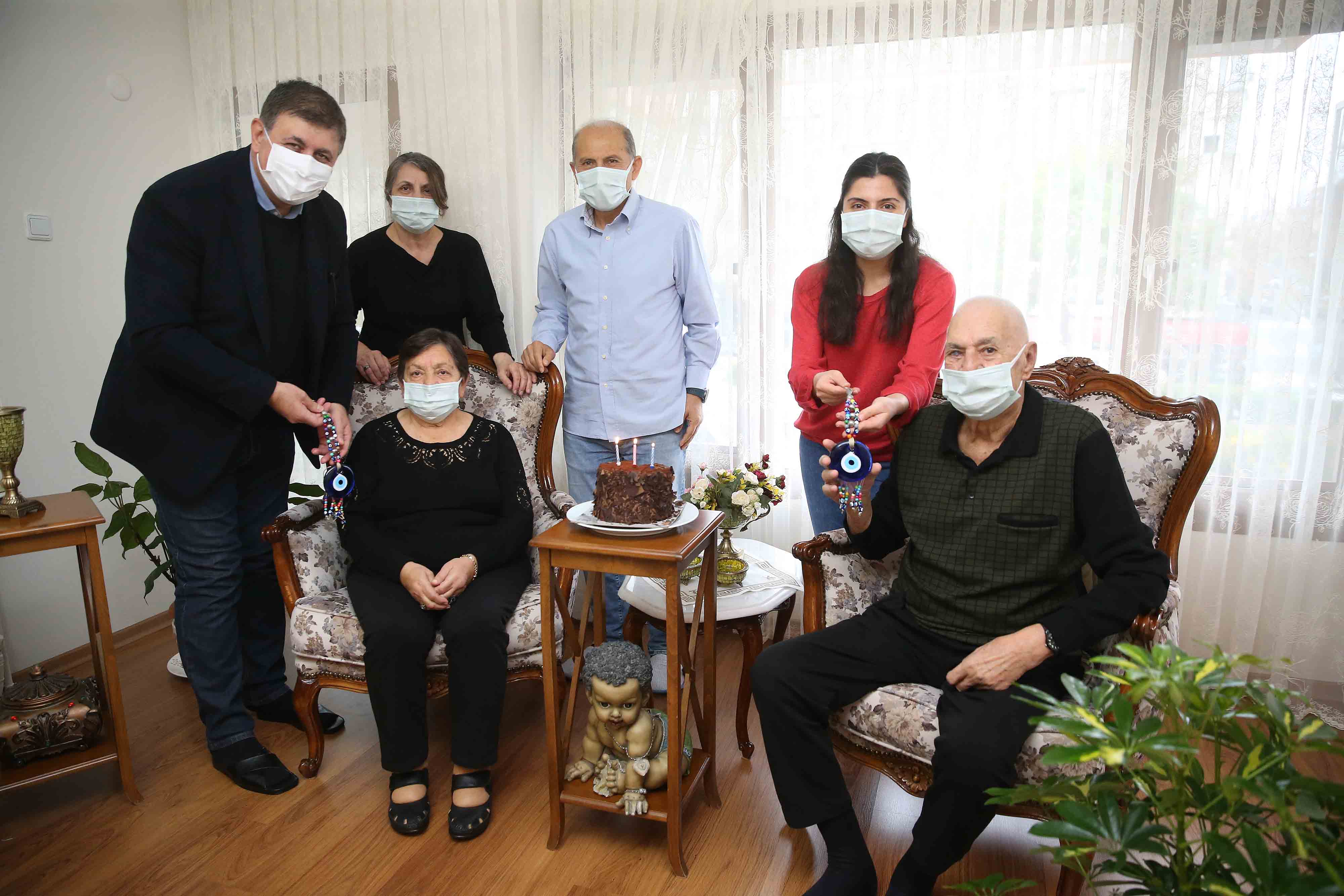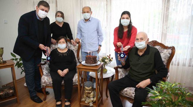 Önce 61 yıllık evli Hatice Akbay (82) ve Hasan Akbay’ın (84) evini ziyaret eden Tugay, ardından da 46 yıllık evli Uğur Durak (75) ve Emine Durak’a (71) konuk oldu. Başkan Tugay, pandemi kuralları çerçevesinde gerçekleştirdiği ziyaretlerde Akbay ve Durak ailelerine pasta, çiçek ve nazar boncuğu armağan etti; birlikte nice sağlıklı ve mutlu yıllar geçirmelerini diledi. Tugay’ı büyük ilgi ve sevinçle karşılayan çiftler de bu anlamlı kutlama karşısında duygu dolu anlar yaşadı.