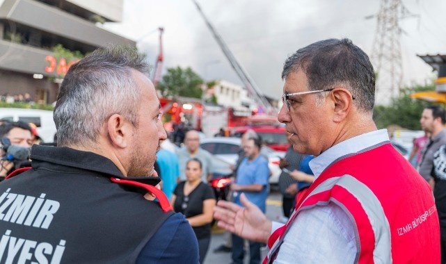 Medicana Hastanesi'nin yakınındaki plastik deposunda çıkan yangın kontrol altına alınırken, İzmir Büyükşehir Belediye Başkanı Dr. Cemil Tugay da yangın bölgesinde incelemelerde bulundu.