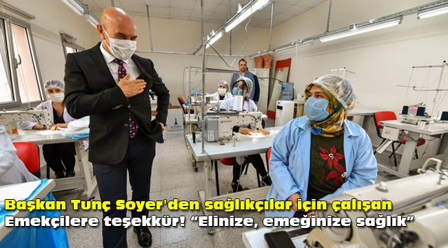 İzmir Büyükşehir Belediye Başkanı Tunç Soyer, koronavirüs salgını nedeniyle risk altında çalışan sağlık personeli için tıbbi maske ve atıştırmalık gıda üreten İzmir Büyükşehir Belediyesi Meslek Fabrikası’nın çalışanları ve gönüllülerini dün ziyaret etti. Mesai saatleri uzayan sağlık çalışanları için poğaça ve kurabiye yapan eğitmenlere, “Çok iyi bir iş yapıyorsunuz. Sağlık çalışanlarımızın motivasyonunu artırıyorsunuz” diyen Soyer, günde yaklaşık iki bin maske üreten dikiş eğitmenlerine de “Elinize, emeğinize sağlık” dedi.