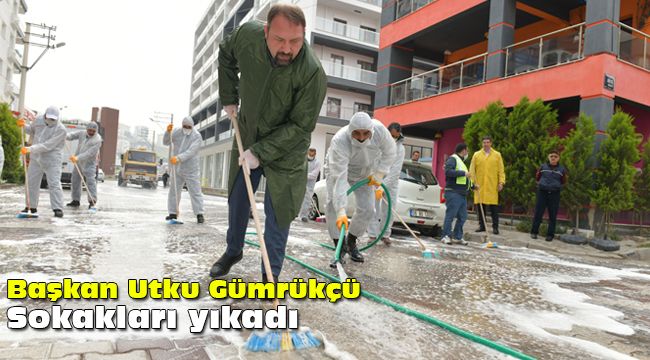 Çiğli Belediye Başkanı Utku Gümrükçü, koranavirüs tedbirleri kapsamında Çiğli’nin 26 mahallesinde sürdürülen yıkama çalışmalarından birine katılarak fırçayla sokakları yıkadı. Başkan Utku Gümrükçü, Balatçık Mahalle Muhtarı Fahrettin Çakıroğlu, belediye bürokratları, temizlik işçileri ve gönüllülerle beraber sokakları yıkadı. Yağmurluğunu giyip, eline fırçasını alan Başkan Gümrükçü, sokakları fırça ile yıkadı. Başkan Gümrükçü, “Bizler 3 gündür Çiğli’nin tüm sokaklarında temizlik uygulaması başlattık. Cumartesine kadar girilmemiş sokak bırakmayacağız. Her pazartesi başlattığımız temiz insanlarız uygulamamıza sokakları yıkamakla devam edeceğiz” dedi.