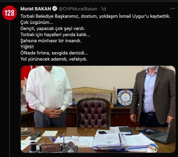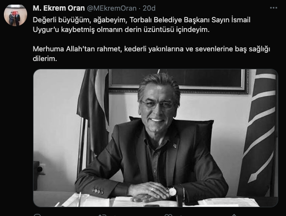 Torun mesajında "Seni unutmayacağız Başkan! Çok üzgünüm... Torbalı Belediye Başkanımız Ramazan İsmail Uygur’u kaybettik. Acımız büyük. Başımız sağolsun. Işıklar içinde uyu..." ifadelerini kullandı.