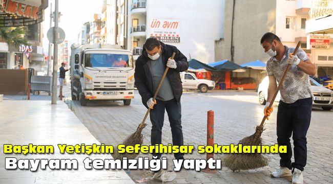 Seferihisar Belediyesi Temizlik İşleri Müdürü Kadir Akay tarafından yürütülen bayram temizliği çalışmalarında ilçede bulunan tüm cadde ve sokaklar yıkandı, mezarlıklarda özel mıntıka temizliği yapıldı, süpürge araçları ile detaylı şekilde süpürüldü, yerler anti bakteriyel ilaçlar ile temizlendi. Ayrıca koronavirüs salgınına karşı da parklar ve çocuk oyun gruplarının bulunduğu alanlar dezenfekte edilmeye devam ediyor.