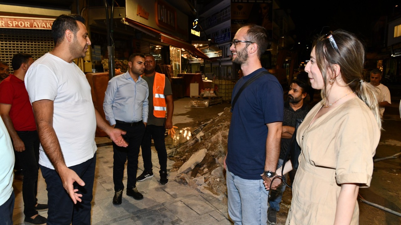 Çiğli Belediye Başkanı Onur Emrah Yıldız, Kasaplar Meydanı yolu zemin yenileme çalışmalarını sürdüren personele gece mesainde destek ziyaretinde bulundu.