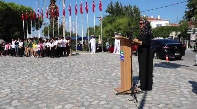 Törenin başlayacağı dakikalarda protokol sırasının hemen arkasında bulunan bir grup gazi, sunuculuk yapan Foça Spor Lisesi edebiyat öğretmeni Ayşe Pınar Bayraktar'ın kıyafetinin uygun olmadığını belirterek, tören alanını terk etti.