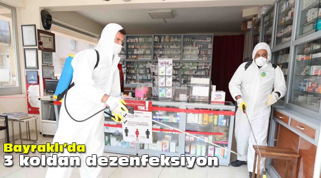 Koronavirüs salgını nedeniyle, ilk günden itibaren aldığı önlemleri hızla hayata geçiren Bayraklı Belediyesi, kurduğu dezenfeksiyon ekibiyle her gün kentin farklı noktalarına ulaşıyor. Dezenfeksiyon çalışmalarını; Temizlik, Fen İşleri, Park Bahçeler, Destek Hizmetler, Kültür, Spor İşleri ve Kütüphane Müdürlüklerinden personelin yer aldığı 51 kişilik ekip yürütüyor. Kenti 3 bölgeye ayıran ekipler; 5 tanker, 4 pikap üstü dezenfekte makinesi, 29 tulumbalı dezenfeksiyon cihazı ile çalışıyor. Çalışmalar kapsamında seyreltilmiş olarak toplam 200 bin litre dezenfektan dış mekanlarda, 20 bin litre dezenfektan da iç mekanlarda kullanılıyor. Ekipler, program dahilinde ilçedeki tüm cadde ve sokakları, parkları, kamu kuruluşlarını, durakları, sağlık kuruluşlarını, eczaneleri, gıda satışı yapan iş yerlerini, toplu taşıma araçlarını, taksileri, asansörleri, çöp kutularını, rögarları dezenfekte ediyor.