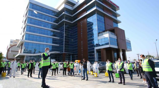 * Farklı müdürlüklerden toplam 51 kişilik ekip tüm cadde ve sokakları, parkları, durakları, minibüs ve taksileri, çöp kutularını, eczaneleri, iş yerlerini dezenfekte ediyor.
