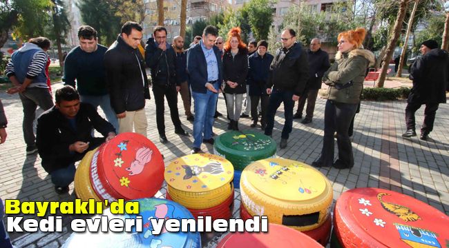 Bayraklı Belediyesi Veteriner İşleri Müdürlüğü, parklardaki eskiyen kedi evlerini yenileriyle değiştirdi. Belediye araçlarından çıkan, hurdaya ayrılmış 80 lastikten yapılan renkli 40 kedi yuvası, eski barınakların yerini aldı.