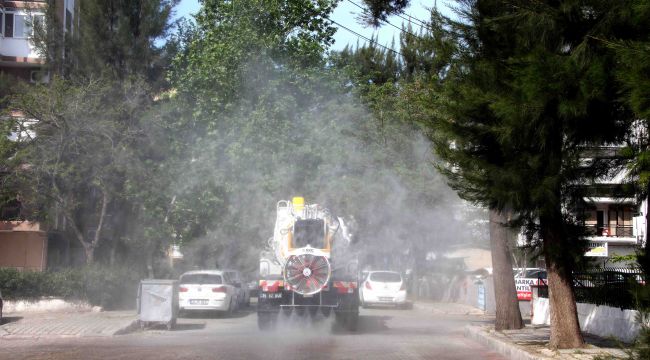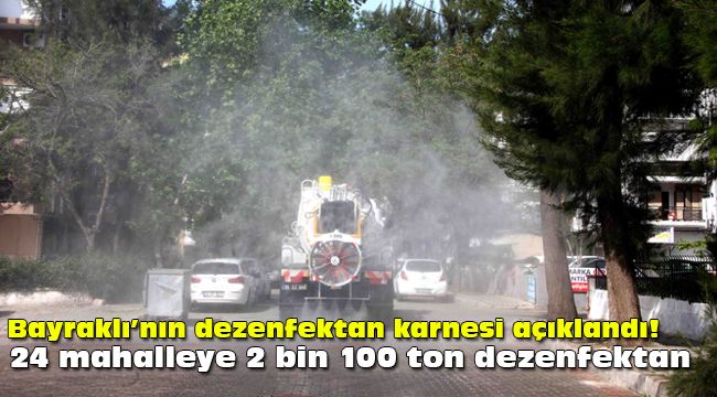 Bayraklı Belediyesi salgının ilk günlerinden bu yana okul, ibadethane, eczane, park, pazar yerleri, sağlık ocakları, kültür merkezleri, muhtarlıklar, kütüphaneler, semt merkezleri, spor tesisleri duraklar, meydanlar ve iş yerleri başta olmak üzere insan yoğunluğunun bulunduğu her alanda dezenfekte çalışmalarına devam ediyor. İlçenin tüm mahallelerinin sokaklarını temizleyerek, dezenfekte eden ekipler, bugüne kadar 25 bin 681 noktada dezenfeksiyon işlemi gerçekleştirdi. 24 mahallede süren çalışmalarda 65 noktaya yerleştirilen el dezenfektan cihazlarında toplam 4 bin 25 litre el dezenfektanı vatandaşın kullanımına sunuldu. 4 bin 247 taşıt, 7 bin 142 iş yeri ve 10 binin üzerinde apartmanı da dezenfekte eden ekipler, toplam 2 bin 100 ton dezenfektan kullandı. Belediye ekipleri 5 tanker, 4 kamyonet arkası dezenfeksiyon cihazı, 2 su tankı, 29 tulumbalı personelle ilçe sokaklarında çalışmalarını sürdürüyor.