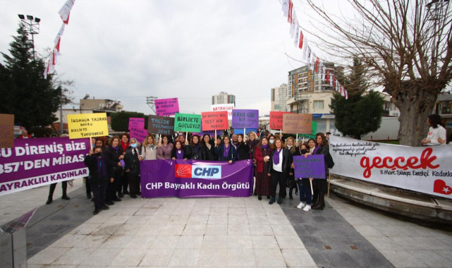 Dünya Emekçi Kadınlar Günü’nde Bayraklı’nın güçlü kadınları tek yürek oldu. Kültür ve Sosyal İşler Müdürlüğü tarafından Yamanlar Mahallesi Nazım Hikmet Parkı’nda düzenlenen etkinlikte kadın cinayetlerine vurgu yapıldı. Son 3 ayda katledilen kadınlar anısına 72 kadının isminin yazılı olduğu panoya kadın ayakkabıları çakılarak farkındalık yaratıldı. Gitarist Haydar Yağmur, müzik dinletisi sundu. Kadınlar, “Dayanışma yaşatır, Boşanmayı Değil Cinayeti Engelle, Yaşasın Kadın Dayanışması” yazılı yaşam, kadın ve özgürlük temalı pankartlar açtı. Olumsuz hava koşullarına rağmen çok sayıda kadının katıldığı etkinlikte hep bir ağızdan özgürlük ve barış sloganları atıldı.