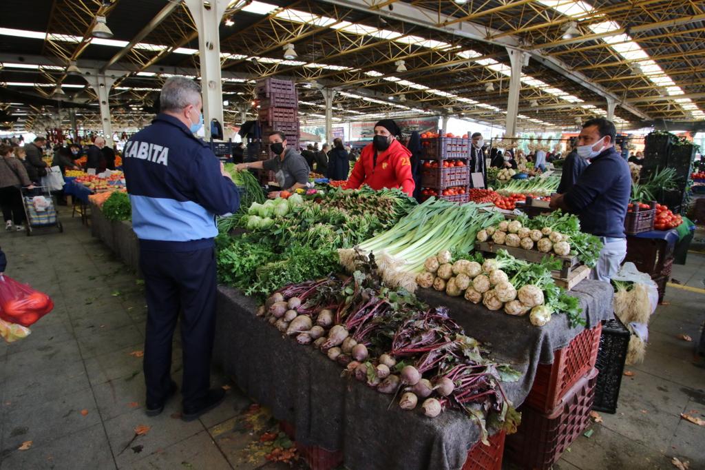Pazar yerlerinde esnaf ve vatandaşa yönelik COVİD-19 tedbirlerini uygulamaya devam eden bayraklı Belediyesi Zabıta Müdürlüğü ekipleri, maskesiz girişlere izin vermiyor. Emniyet müdürlüğü ekipleriyle koordineli şekilde ilçede kurulan 17 pazar yerinde girişleri ve çıkışları kontrol altına alan ekipler, alışverişe gelenlerin ateşini ölçüyor. Girişlerde vatandaşların öncelikle ellerini dezenfekte etmeleri isteniyor. Ekipler, vatandaş ve pazar esnafına sosyal mesafe, maske ve hijyen kurallarına uymaları için de ikazlarda bulunuyor.