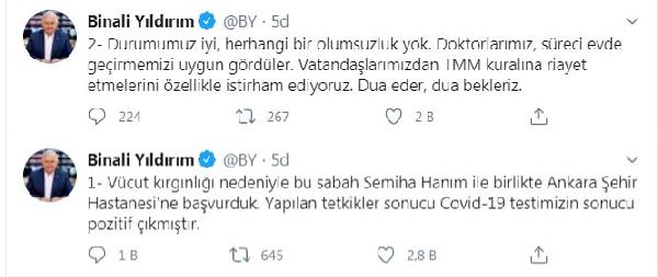 Binali Yıldırım, "Vücut kırgınlığı nedeniyle bu sabah semiha Hanım ile birlikte Ankara Şehir Hastanesi'ne başvurduk. Yapılan tetkikler sonucu covid-19 testimizin sonucu pozitif çıktı.