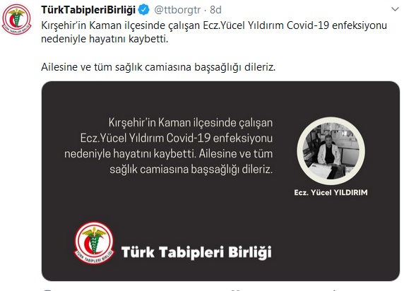 "Kırşehir’in Kaman ilçesinde çalışan Ecz.Yücel Yıldırım covid-19 enfeksiyonu nedeniyle hayatını kaybetti.