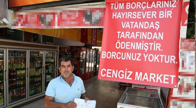 Muratpaşa ilçesi Soğuksu Mahallesi'nde, adını vermek istemeyen hayırsever, marketin veresiye defterini satın aldı. 6 bin 500 TL'lik borcu ödeyen hayırseverin, market sahibinden tek isteği borçların ödendiğine dair markete bir afiş asması oldu. Sabah borçlarını ödemek için markete gelenlerden bazıları defterinin satın alındığını öğrenince büyük şaşkınlık yaşarken, bazıları da büyük sevinç yaşadı.