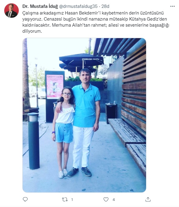 Bornova Belediye Başkanı Mustafa İduğ acı haberi sosyal medya hesabından duyurdu. Başkan İduğ, "Çalışma arkadaşımız Hasan Bekdemir’i kaybetmenin derin üzüntüsünü yaşıyoruz. Cenazesi bugün ikindi namazına müteakip Kütahya Gediz'den kaldırılacaktır. Merhuma Allah’tan rahmet; ailesi ve sevenlerine başsağlığı diliyorum." açıklamasını yaptı.