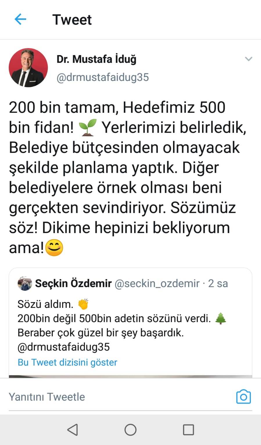 Yaşar Üniversitesi’nde çalışan Seçkin Özdemir’in; “Merhaba. Biliyorsunuz Twitter’da bir akım var. Benim de yıllardır merak ettiğim bir şey var. Belediye başkanı olmak nasıl bir his. Kaç fav alırsam 1 günlüğüne belediye başkanı olabilirim” şeklinde attığı tweete cevap; “Biz öyle yapmayalım. Gel beraber iyi bir şey yapalım. Sana söz alacağın her fav için bir fidan dikeceğim” sözleriyle Bornova Belediye Başkanı Dr. Mustafa İduğ’dan geldi. Özdemir’in attığı tweet kısa sürede 200 bine yakın fav alırken, Başkan İduğ ile Genç twitter kullanıcısı bir araya geldi. Seçkin Özdemir’e lavanta fidanı hediye eden İduğ, büyük ilgi çeken etkileşimi bornova belediyesi olarak bir kampanyaya dönüştüreceklerini söyledi. “200 bin de yetmez” diyen Başkan Mustafa İduğ, Bornova’nın nüfusunu hatırlatarak hedeflerinin 500 bin fidan, yani her Bornovalı için bir fidan dikmek olduğunu belirtti. İduğ, fidan dikim alanlarını Bornova-Bayraklı sınırı, İzyuva ve Eğridere olmak üzere üç bölgede belirlediklerini ifade ederek, “Ege Orman Vakfı’nın yaptığı fidan bağışı ile başlıyoruz. Biz sözde değil, gerçek anlamda yeşil bir Bornova yaratmak istiyoruz” dedi. Başkan İduğ’a hassasiyeti için çok teşekkür eden Seçkin Özdemir ise “Böyle bir geriş dönüş yapacağınızı tahmin etmiyordum. Etkileşimimiz büyük ilgi gördü. Sizden sonra Türkiye’nin dört bir yanından belediye başkanları da yazdı. Ben 10 yıldır İzmir’de yaşıyorum ama aslen İskenderunlu’yum. Büyük yangında oradaydım. Gördüklerim ve yaşadıklarım yeşile karşı olan duyarlılığımı daha da arttırdı. Bu nedenle sizin tweetime bu şekilde bir dönüş yapmanız beni daha çok mutlu etti. Umarım koyduğunuz hedefi hep birlikte gerçekleştiririz” diye konuştu.
