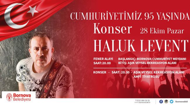 Bornovalılar 29 Ekim Cumhuriyet Bayramı’nı iki gün süren etkinlikler ile kutlayacak. Kutlamalar kapsamında 28 Ekim Pazar günü Pınarbaşı’nda saat 13:00’te Rahvan At yarışları Cumhuriyet Koşusu yapılırken, Fener Alayı yürüyüşü de saat 20:00’de Cumhuriyet Meydanı’ndan başlayacak. Mustafa Kemal Caddesi üzerinden Aşık Veysel Rekreasyon alanına yapılacak yürüyüşün ardından Amfi Tiyatro’da Bornovalılar haluk levent konseri ile Cumhuriyet çoşkusunu yaşayacak.