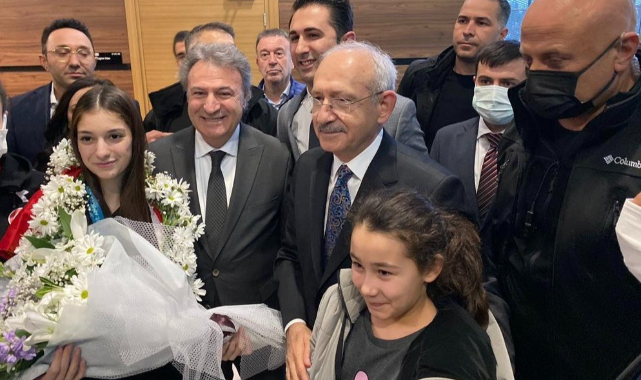Trampolin Cimnastik Dünya Kupası'nda altın madalya kazanan Bornova Belediyespor Kulübü sporcusu Sıla Karakuş, Azerbaycan'ın başkenti Bakü'de düzenlenen organizasyonun dönüşünde İzmir Atatürk Havalimanı’nda CHP Genel Başkanı Kemal Kılıçdaroğlu ile buluştu. Kılıçdaroğlu, milli sporcuyu kutlayıp 5 yaşından bu yana kendisine her türlü desteği veren Bornova Belediyesi’ne teşekkür ederek madalyasını taktı.