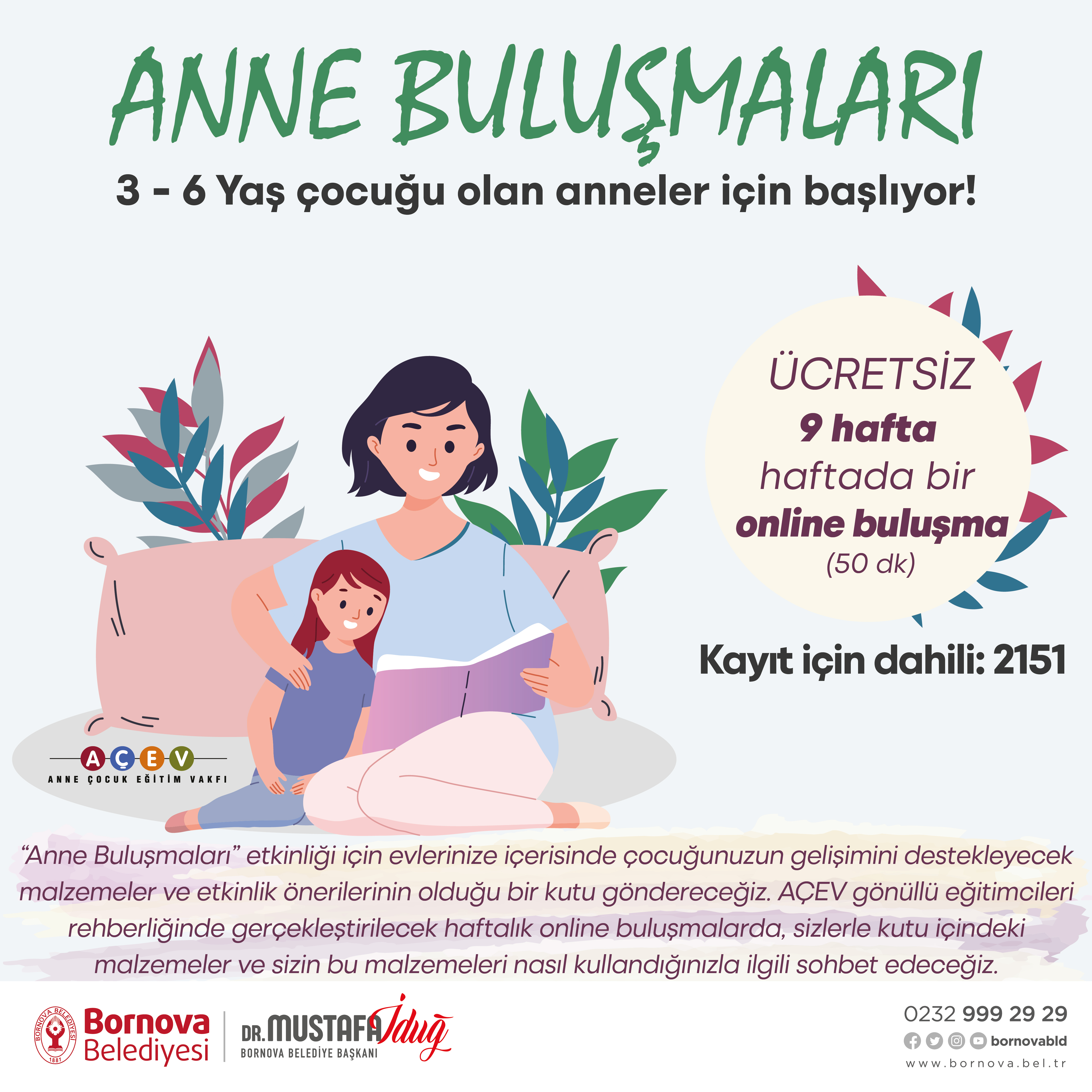 9 hafta boyunca, haftada bir gün ve 50 dakikalık oturumlar şeklinde on-line olarak gerçekleştirilecek etkinliğe katılmak isteyen annelerin Ocak Ayı sonuna kadar Bornova Belediyesi’nin 0232 999 29 29 numaralı santral numarasından dahili 2151’e kayıt yaptırması gerekiyor.