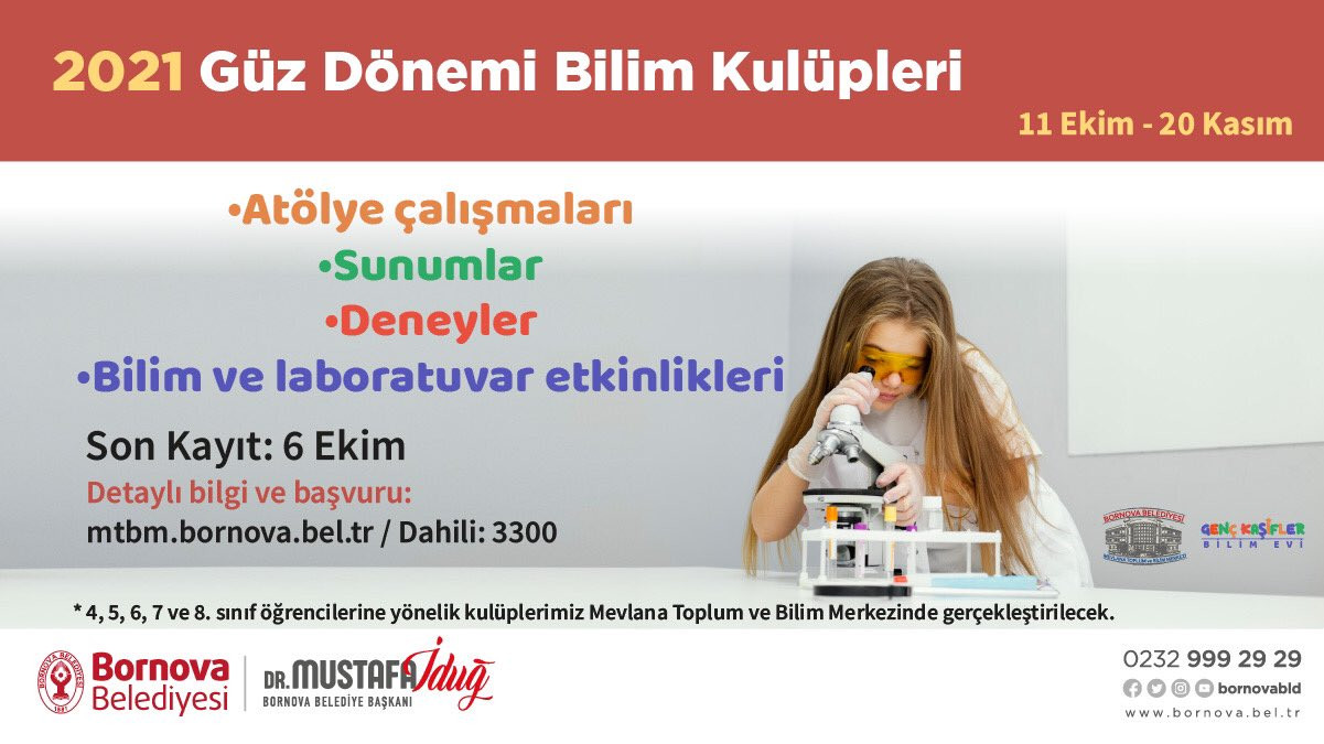 Haftada 1 gün 60 dakikalık yüz yüze gerçekleştirilecek olan dersler Pazar hariç her gün yapılacak. Tamamı ücretsiz olan etkinliklere düzenli katılım sağlayan öğrencilere program sonunda katılım belgesi verilecek. Başvurular bornova belediyesi Mevlana Toplum ve Bilim Merkezi’ne şahsen ya da mtbm.bornova.bel.tr adresinde yer alan elektronik form aracılığıyla yapılabilir. “Eğitime desteğimiz sürecek”Bornova Belediye Başkanı Dr. Mustafa İduğ, katılımcı ve yaratıcı öğretim teknikleriyle Bornovalı gençlere bilimi sevdirmeyi hedeflediklerini dile getirdi. Geleceğin bilim insanlarını yetiştirmek istediklerini ifade eden Başkan İduğ, “Eğitimde marka kent olarak biliniyoruz. BELGEM ve Dijital Sınıf ile birlikte ivme kazandırdığımız eğitim çalışmalarımızı çeşitli kurslar ve atölyeler aracılığıyla tabana yayarak her yaştan Bornovalıya ulaşıyoruz. Bilim Kulüplerimizle birlikte Bornovalı çocuklara bilimsel, özgür ve yaratıcı düşünme alışkanlığı kazandırıyoruz. Önümüzdeki dönemde eğitime yönelik yatırım ve çalışmalarımız artarak devam edecek” diye konuştu.