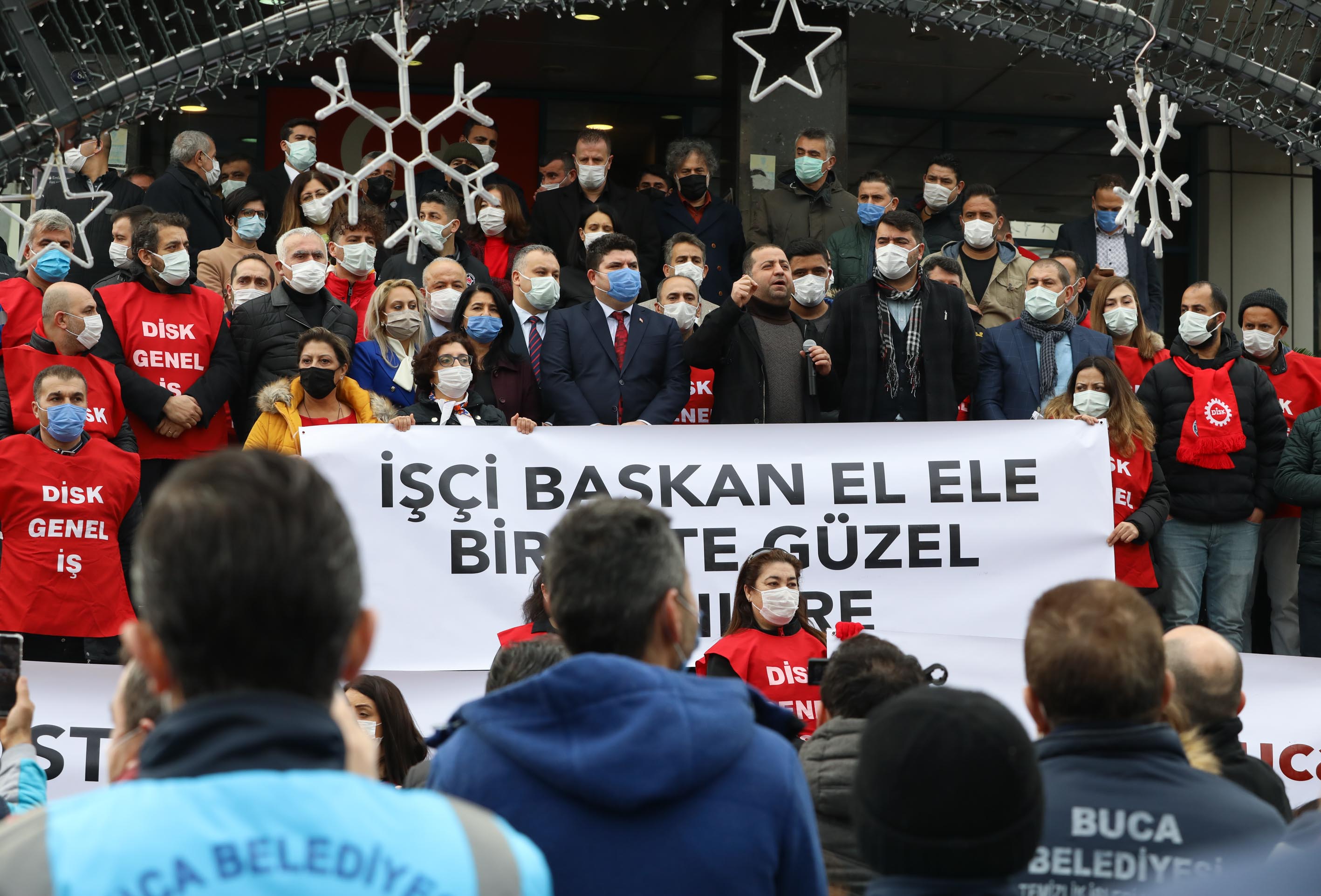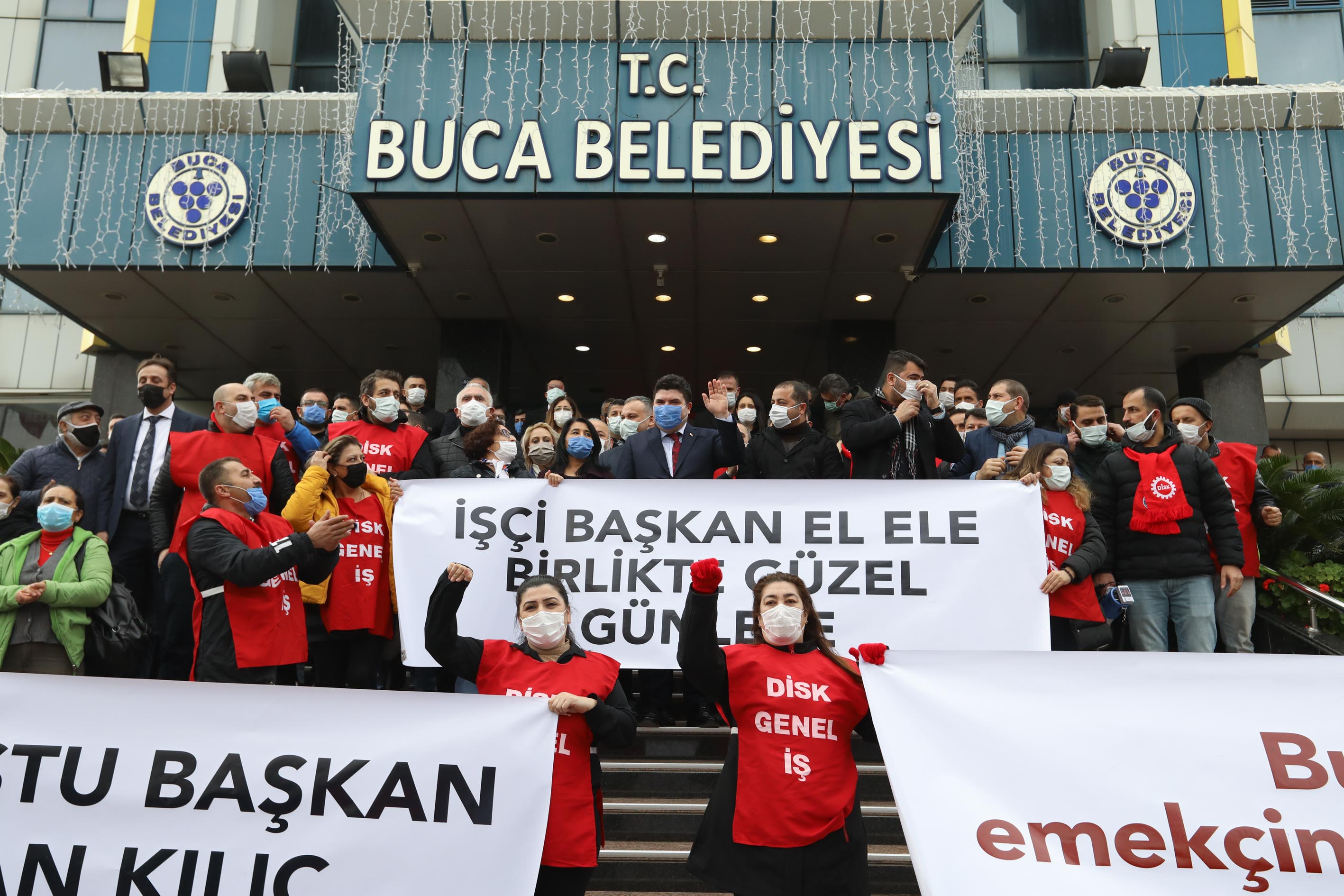 Toplu İş Sözleşmesi’nin bilgilendirme toplantısı buca belediyesi Hizmet Binası önünde, bayram havasında gerçekleştirildi. Açıklamaya Buca Belediye Başkanı Av. Erhan Kılıç, DİSK Ege Bölge Temsilcisi Memiş Sarı, CHP Buca İlçe Başkanı Hacer Taş Gültepe, İYİ Parti Buca İlçe Başkanı Gamze Bilgen Torun, DİSK Genel İş 5 No’lu Şube Başkanı Ali Haydar Kara, Buca Belediyesi Meclis üyeleri ve yüzlerce belediye çalışanları katıldı. Alana, sahada görevli temizlik ve park işçileri sloganlarla, davul zurnayla girdi. İşçiler belediye önünde pankartlar açarak “İşçi dostu başkan Erhan Kılıç”, “Buca emeğin yanında”, “Emeğin kalesi Buca”, “İşçi başkan el ele birlikte güzel günlere” sloganları atıldı. Belediye önünde sosyal mesafe kurallarına dikkat edilerek halaylar çekildi, hep bir ağızdan devrim türküleri söylendi.