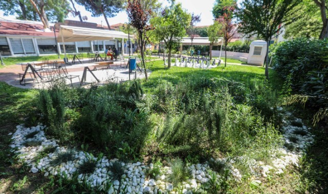 Daha sonra, Işılay Saygın Gençlik Merkezi’nin bahçesinde yağmur bahçesi uygulama alanı oluşturuldu. Kuraklığa dayanıklı 9 farklı bitki seçilerek iklime dayanıklı yeşil alan yaratıldı. Ayrıca, merkezin bahçesine kurulan ve güneş enerjisi kullanılarak öğrencilerin elektronik cihazlarını şarj etmelerini sağlayacak 2 adet solar bank ile elektrik giderlerinin de azaltılması hedefleniyor.