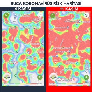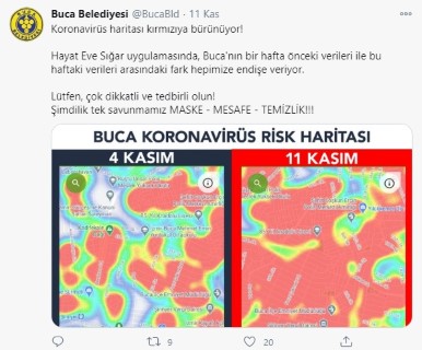 Belediye yapılan paylaşımda, “Koronavirüs haritası kırmızıya bürünüyor! Hayat Eve Sığar uygulamasında, Buca'nın bir hafta önceki verileri ile bu haftaki verileri arasındaki fark hepimize endişe veriyor.