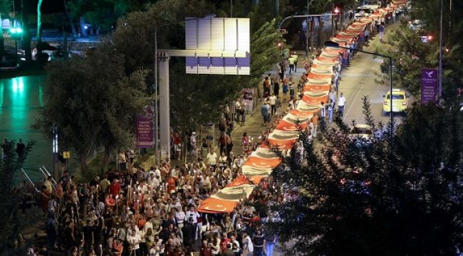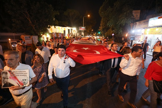 KutlamalarBuca Belediye Hizmet Binası’nınönünde toplanan Bucalılar meşaleler ve marşlar eşliğinde yürüyüşe başlandı. Menderes Caddesi üzerinden Kasaplar Meydanı’na doğru ilerleyen kortejde, Buca Belediye Başkanı Av. Erhan Kılıç ile birlikte bir kilometrelik dev Türk bayrağı açıldı.
