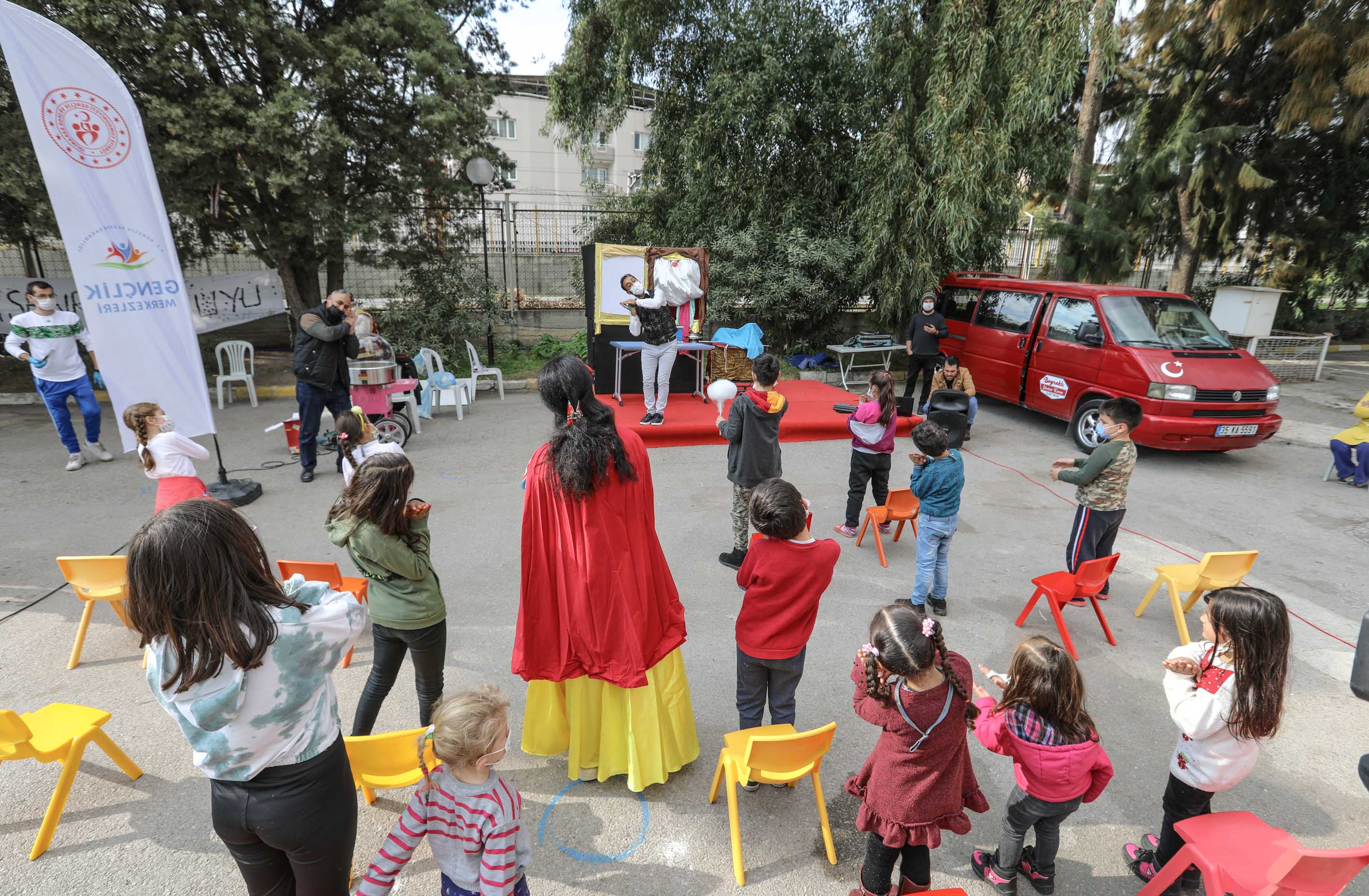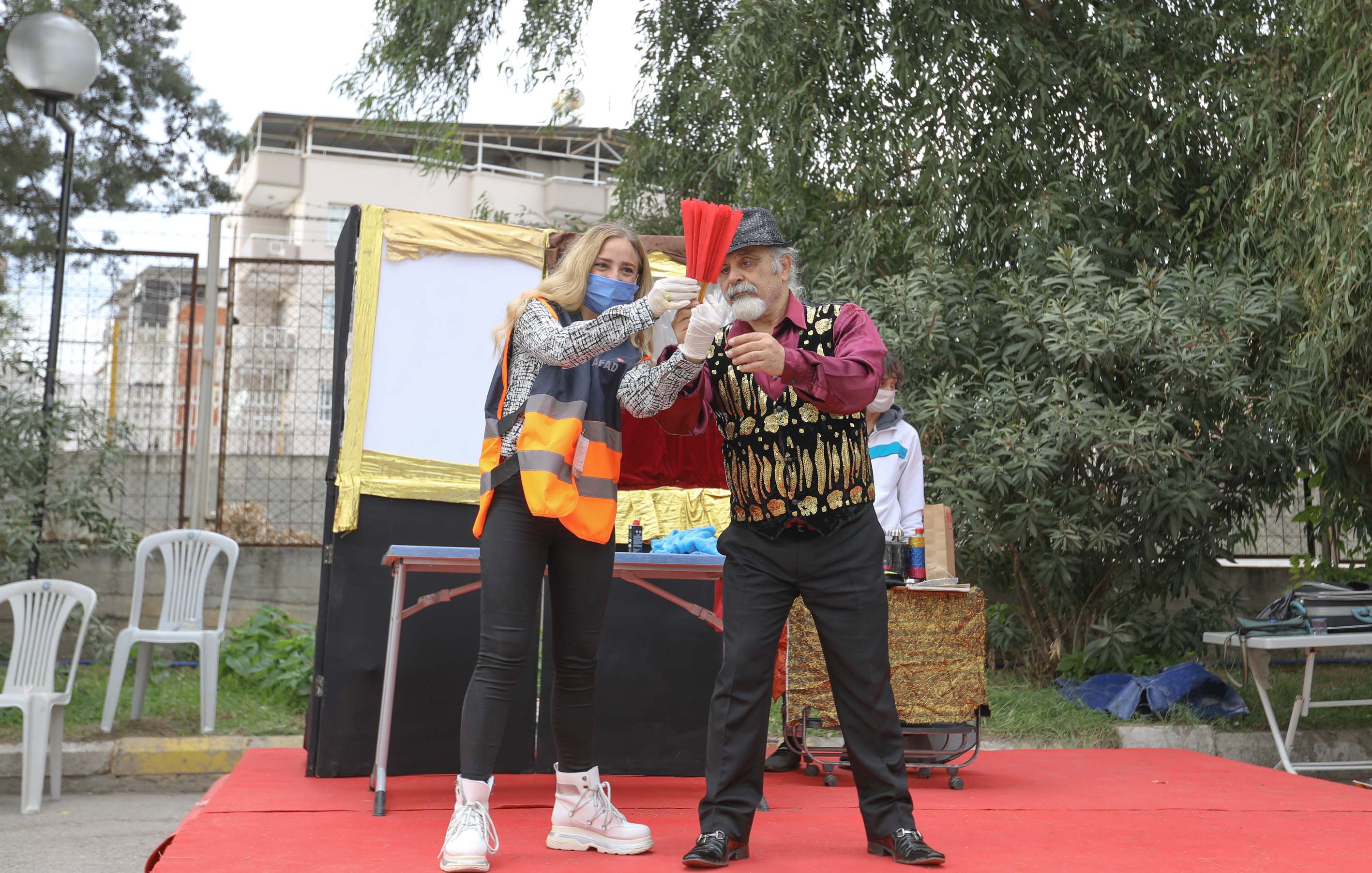 Minikler, animatör gösterisinin ardından tiyatro ekibi tarafından sahnelenen kukla oyununu izledi. Kahkahaya doyan çocuklara oyunda eğitici ve öğretici bilgiler verilirken özellikle koronavirüs (Covid-19)salgına karşı tedbirlerin alınması gerektiği anlatıldı.