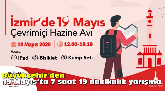 İzmir Büyükşehir Belediyesi korona günlerinde 19 Mayıs coşkusunu evlere taşıyor. Dijital platformlardan yayınlanacak pek çok etkinliğin yanı sıra Çevrimiçi Hazine Avı adlı bir yarışma da düzenliyor. 7 saat 19 dakikalık Çevrimiçi Hazine Avı, öncelikle gençlerin olmak üzere tüm İzmirlilerin evlerinde keyifli bir bayram geçirmesini amaçlıyor. Yarışma resim, video, metin gibi çeşitli dosya formatlarıyla hazırlanmış şifreleri çözme ve her şifreyi çözdükten sonra verilecek görevi yerine getirme esasına dayanıyor. Yarışmada yaş sınırlaması bulunmuyor.
