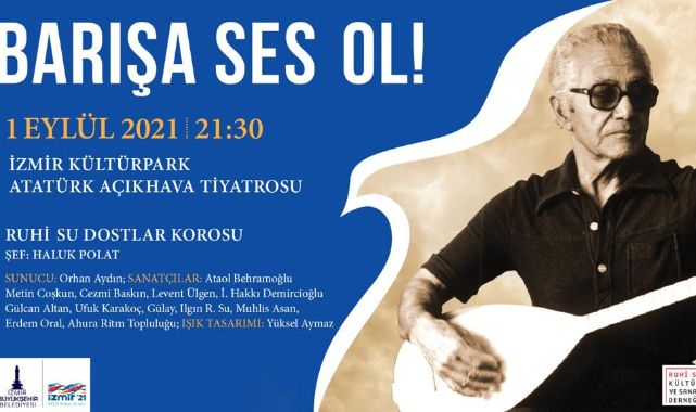 İzmir Büyükşehir Belediyesi 1 Eylül’de “Barışa Ses Ol” konseri düzenliyor. Kültürpark Atatürk Açıkhava Tiyatrosu'nda yapılacak konserde Ruhi Su Dostlar Korosu sahnede olacak. Ücretsiz konser 21.30’da başlayacak.