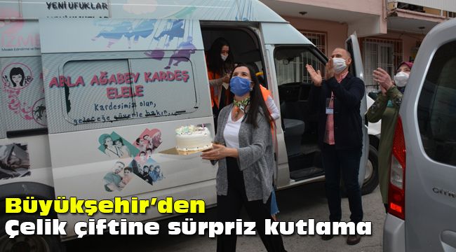 İzmir Büyükşehir Belediyesi Suzan-Mehmet Çelik çiftine 50. evlilik yıldönümlerinde sürpriz bir kutlama hazırladı. Ellerinde balon ve pastayla İzmir Büyükşehir Belediyesinin personelini ve İzmir Gönüllü Takımı’nı kapıda gören Çelik çifti mutluluğunu gizleyemedi.