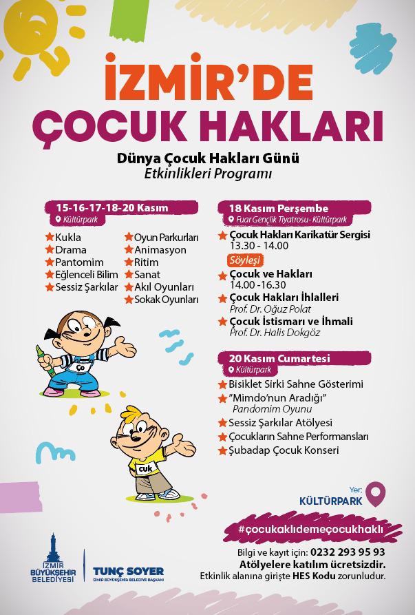 “#çocukaklıdemeçocukhaklı" sloganıyla İzmir Büyükşehir Belediyesi Sosyal Projeler Dairesi Başkanlığı Çocuk Belediyesi Şube Müdürlüğü düzenlenen etkinlikler kapsamında Kültürpark’ta kukla, drama, pandomim, eğlenceli bilim, sessiz şarkılar, oyun parkurları, animasyon gösterisi, ritim, sanat, akıl oyunları ve sokak oyunları olmak üzere çok sayıda atölye kurulacak. 20 Kasım Cumartesi günü ise Bisiklet Sirki Sahne Gösterimi, Mimdo’nun Aradığı isimli pandomim oyunu, Sessiz Şarkılar Atölyesi, çocukların sahne performansı ve Şubadap Çocuk Konseri olacak.