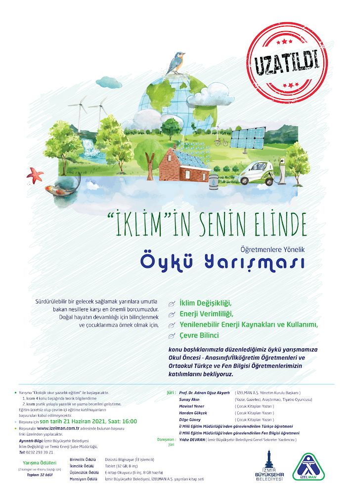 Yarışmaya ‘Sürdürülebilir bir gelecek sağlamak, yarınlara umutla bakan nesillere karşı en önemli borcumuzdur' mottosu ile yola çıkan İzmir Büyükşehir Belediyesi ve İştiraki İZELMAN A.Ş., çocuklarımıza daha iyi örnek olabilmek adına doğal hayatın devamlılığı ve sürdürülebilirlik için iklim değişikliği, enerji verimliliği, çevre bilinci,yenilenebilir enerji kaynakları ve kullanımı konularını ele alan, öğretmenlere yönelik öykü yarışması düzenliyor. Yarışmanın jürisinde edebiyatçı Sunay Akın ve çocuk kitapları yazarları Mavisel Yener, Handan Gökçek, Dilge Güney gibi ünlü isimler de yer almakta.