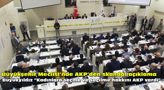 İzmir Büyükşehir Belediyesi Şubat ayı olağan meclisinin son oturumu gerçekleştirildi. İzmir Büyükşehir Belediyesi Meclis Tolantı salonunda gerçekleştirilen toplantıya, İzmir Büyükşehir Belediye Başkanı Tunç Soyer Başkanlık yaptı. Meclise ise akp meclis üyesi Dilek Büyükyıldız’ın açıklamaları damga vurdu. Söz alan Büyükyıldız, seçme ve seçilme hakkının kadınlara AKP tarafından verildiğini söyledi. Büyükyıldız sonrası söz alan Kökkılınç ise kadınlara seçme ve seçilme hakkını Mustafa Kemal Atatür’ün verdiğini söyledi.