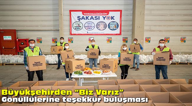 İzmir Büyükşehir Belediyesi “Biz Varız” dayanışma kampanyasında çalışan gönüllüler için teşekkür buluşması düzenliyor. Buluşma, dayanışma kampanyasının çağırıcısı Başkan Tunç Soyer’in katılımıyla 26 Haziran Cuma 18.30’da Tarihi Havagazı Fabrikası Gençlik Yerleşkesi’nde yapılacak. Müzik dinletisinin de olacağı buluşmada gönüllülere sertifikaları takdim edilecek.