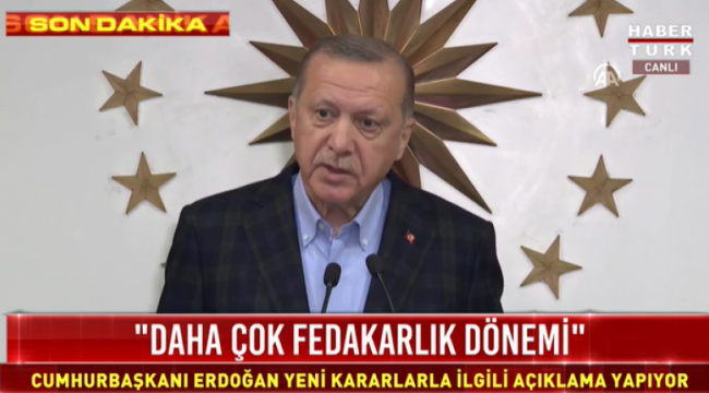 AKP Genel Başkanı ve Cumhurbaşkanı Erdoğan, koronavirüs tedbirleri kapsamında alınan yeni kararları kamuoyuna duyuruyor.Sağlık Bakanı Fahrettin Koca, Koronavirüs Bilim Kurulu'nun önerilerinin Erdoğan'a iletildiğini ve Erdoğan'ın kararı açıklayacağını ifade etmişti.Erdoğan'ın açıklaması şöyle:Dünyanın tamamını etkisi altına alan covid 19 hastalığı giderek yaygınlaşıyor, daha çok can alıyor. Bu felaket herkesle birlikte bizi de etkilemiştir. 5698 tespit edilmiş toplam vaka 92 can kaybı vardır.Hayatlarını kaybeden vatandaşlarımıza Allah'tan rahmet yakınlarına başsağlığı diliyorum. Covid 19 hastalığı ile mücadelemizi kararlılıkla sürdüyoruz. Daha çok fedekarlık yapmamız gereken bir döneme girdik.Şu hususları asla aklımızdançıkarmamalıyız: Rehavete kapılmayacağız. Karşımızdaki tehdit çok ciddidir. Paniğe asla kapılmayacğaız. Bu tehdide karşı sağlam bir mücadele yürütüyoruz. Bir yandan devlet olarak her türlü tedbiri alacağız diğer yandan vatandaşlarımızın her biri bireysel tedbirleri alacak. Her kesimi kapsayan pek çok ekonomik tedbiri hayata geçirdik geçiriyoruz. En düşük emekli maaşını bin 500 liraya çıkartarak nefes aldırdık.İstihdamı korumak amacıyla kısa çalışma ödeneğinin şartlarını kolaylaştırdık. Telafi çalışma süresini kısalttık. Üretimin ve ihracatın devamı en önemli önceliğimizdir. Milletimizin her bir ferdi devletinin tüm imkanlarıyla yanında olduğunu biliyor. Bu ülkede kimsenin aç açıkta kalmasına mağduriyetine istikaline izin vermeyeceğiz. Çocuklarımıza nasıl gözümüz gibi bakıyorsak büyüklerimize aynı ihtimamı göstereceğiz. Tüm bu tedbirleri titizlikle uyguladığımızda en kısa sürede meselenin üstesinden gelebileceğimizi görüyoruz. Türkiye bu salgın dönemine olabilecek en hazırlıklı şekilde yakalandı. Türkiye pek çok konuda kendi kendine yeterli olmanın avantajlarını yaşıyor.