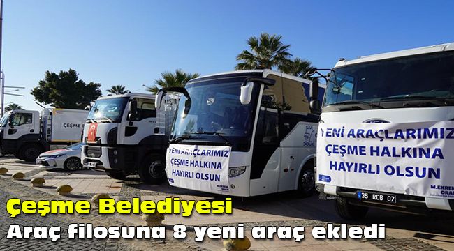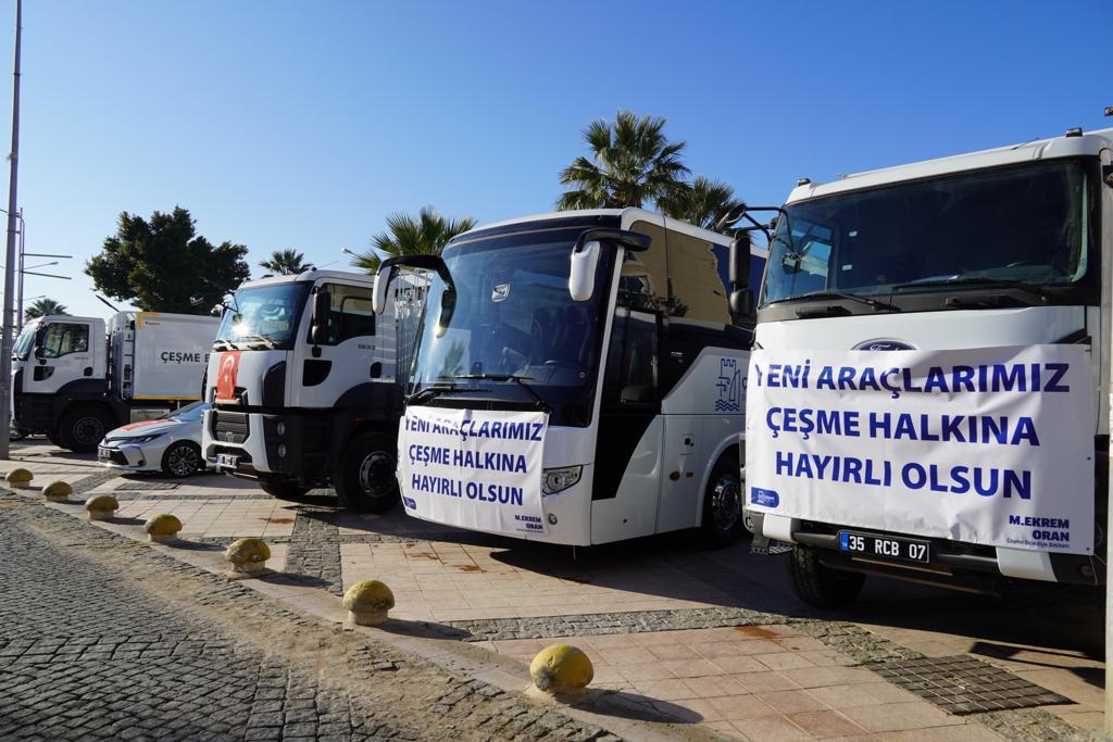 İlçeye yapılan hizmetlerin hız kazanmasıyla ihtiyaç duyulan 8 yeni aracın belediye filosuna eklendiğini belirten Çeşme Belediye Başkanı M. Ekrem Oran, Vatandaşlara daha hızlı ve verimli hizmet vermek amacıyla araç filosunu büyüterek, ihtiyaç duyulan 3 adet çöp kamyonu, 1 adet damperli kamyon, 1 adet otobüs, 2 adet doblo ve 1 adet binek aracı olmak üzere toplam 8 adet aracın belediye hizmetlerinde kullanılacağını söyledi.